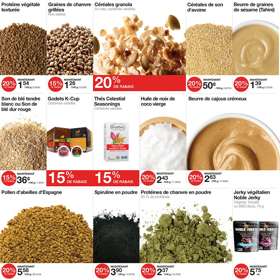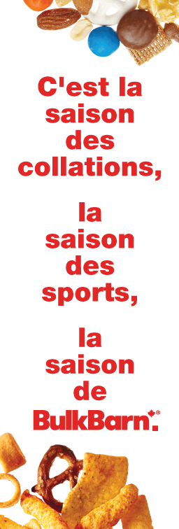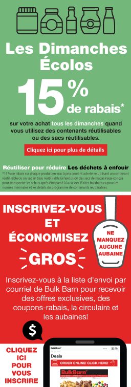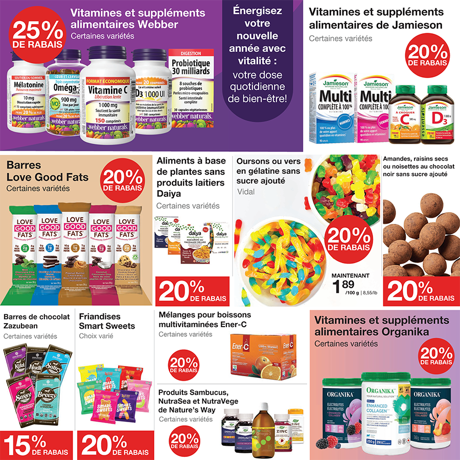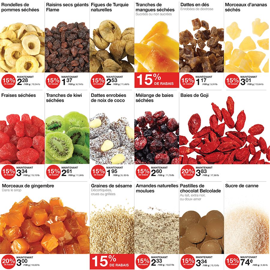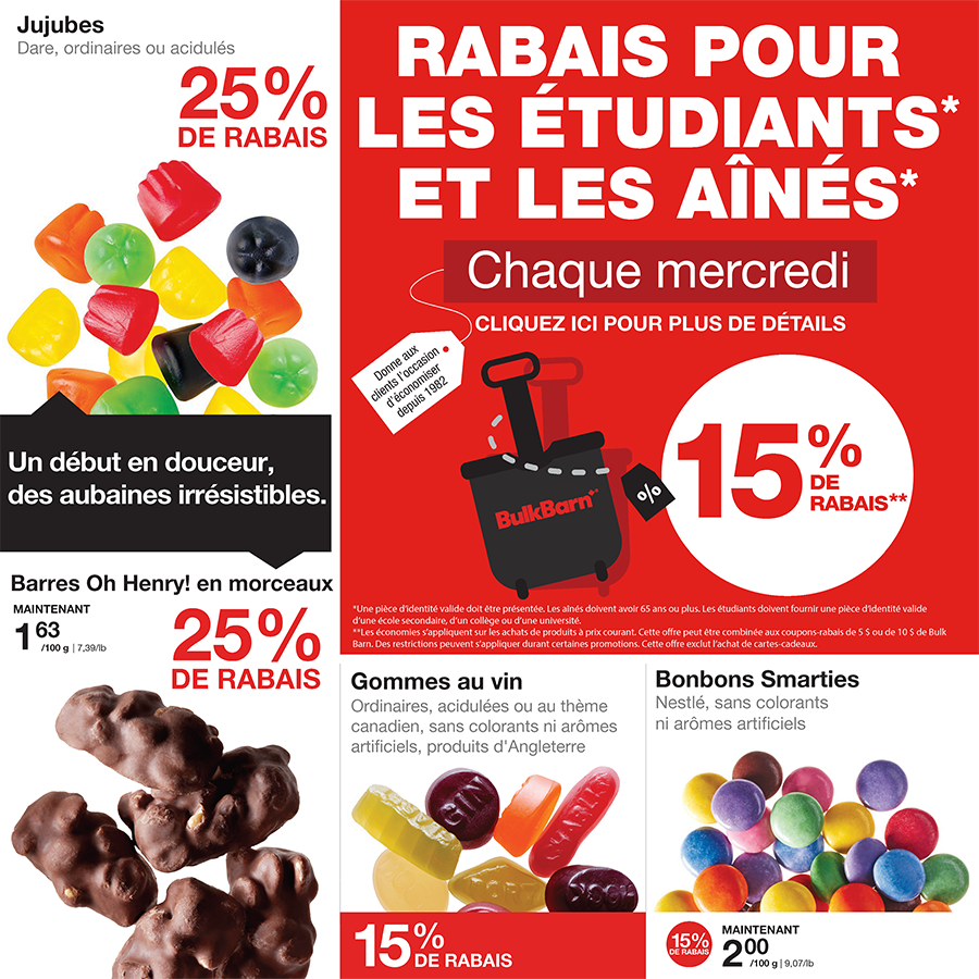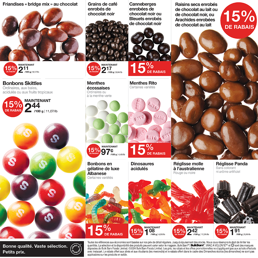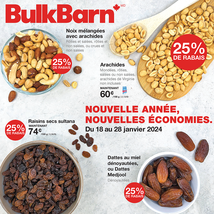 An advertisement for bulkbarn shows nuts and raisins A red sign that says coupon-rabais available jusqu ' au dimanche 28 janvier 2024 An advertisement for bulkbarn gummy bears and bonbons smarties An advertisement for jaimeson body vitamins and supplements Fre o f0124 page An advertisement for eco-friendly sundays in french Fre o f0124 page Fre o f0124 page A sign that says it's snack season sports season bulkbarn season Fre o f0124 page